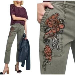 Anthropologie Floral Embroidered Wanderer Utility Pants Cotton Linen Green