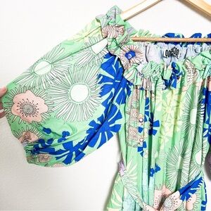 Vibrant floral maxi dress. Off-shoulder design. Puffy sleeves. Runs Large. Could easily fit up to a medium.