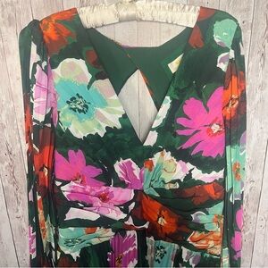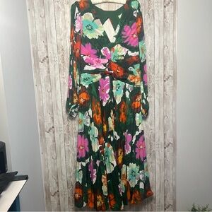 This elegant dress features a vibrant green and pink floral pattern, perfect for a wedding guest or cocktail occasion. The fit and flare design is complemented by a flattering V-neckline and bishop sleeves, creating a sophisticated silhouette. The pleated skirt adds graceful movement, making it a standout piece for any event. Excellent condition, size 14