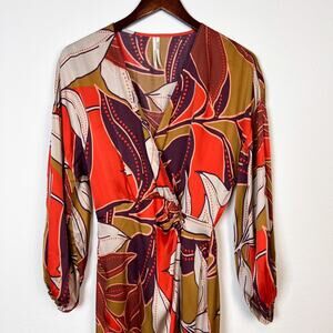 Anthropologie Floral Printed Satin Long Sleeve Wrap Midi Dress Size Small
