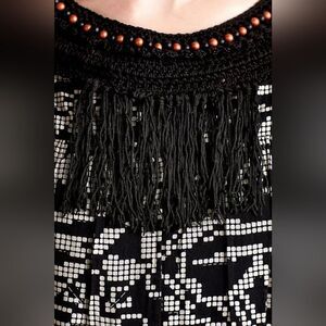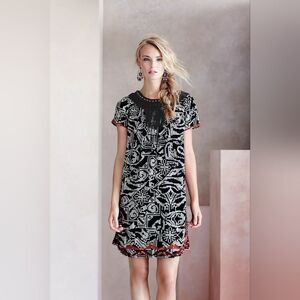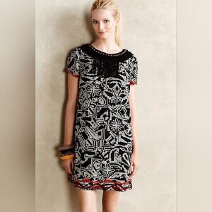 Anthropologie Floreat Abelia Black White Embroidered Fringe Mini Shift Dress M