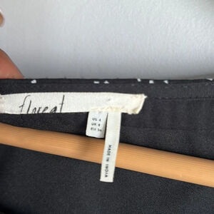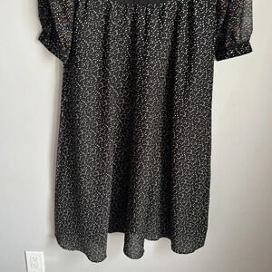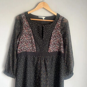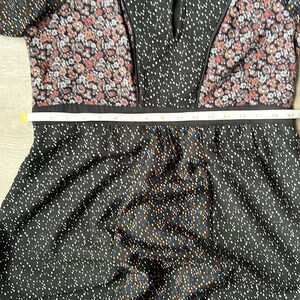 Flowy, mixed pattern, sheer quarter sleeved, slightly hi-low hem dress from Anthropologie.  Lined throughout except the sleeves which are sheer. 100% polyester.