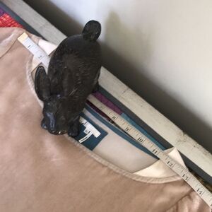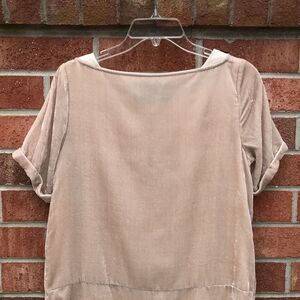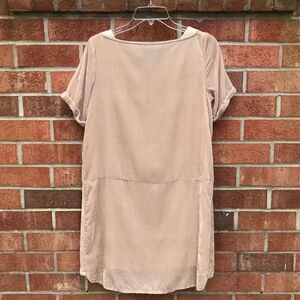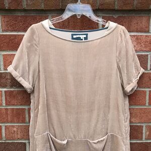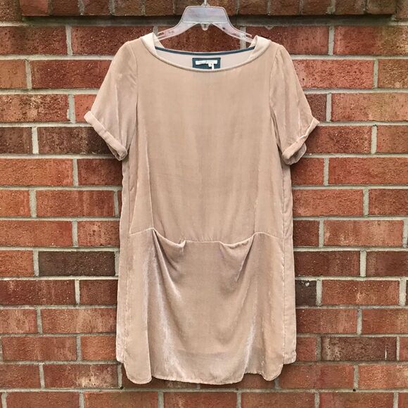 Anthropologie Floreat Crinkle Velvet Sheath Dress, sz XS, Tan Color, Short Sleeve Popover Style, Lined, Front Pockets, in great pre-owned condition