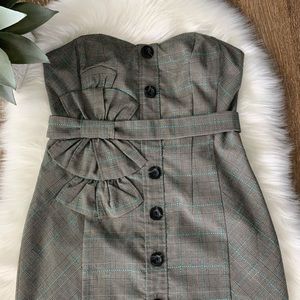 Sleeveless strapless dress with front buttons. Belted waist with bow. Fitted pencil dress. Midi length. Black buttons and blue plaid trim.