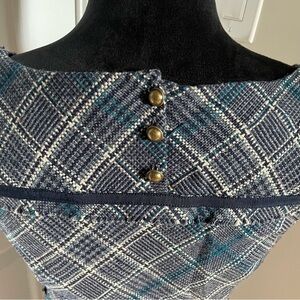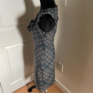 Plaid dress from Floreat by Anthropologie. This dress features a wool polyester blend fabric, classic plaid pattern, white floral fabric design accent, above the knee length.