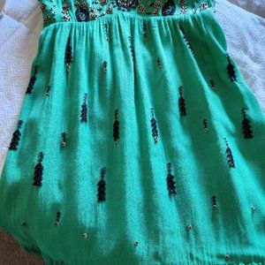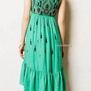 Anthropologie Floreat Ijada Green Embroidered Sequin Stitch Hi-Low Ruffle Dress