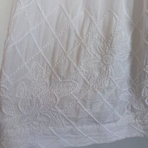 Beautiful full knee length skirt in white with a tone on tone floral trellis embroidery along the bottom. Light cotton voile over a cotton lining. Side zipper.