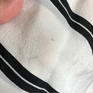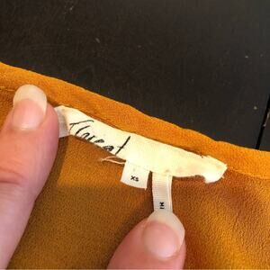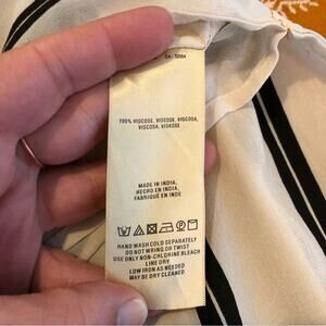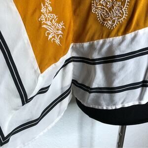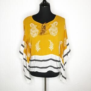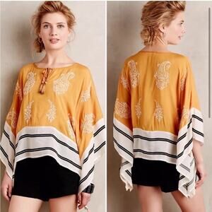 Anthropologie Floreat golden yellow embroidered kimono top. Pullover style with tassels that tie at front neckline. Wide flowy kimono style sleeves. Gold with white paisley floral embroidery and contrasting black and white striped material. Slightly sheer material. Overside fit. Size XS. Excellent preowned condition. One tiny mark on sleeve as shown. 100% viscose.