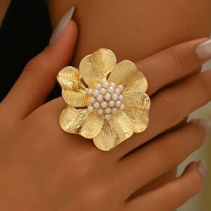 Anthropologie Flower Gold Pearl Adjustable Ring