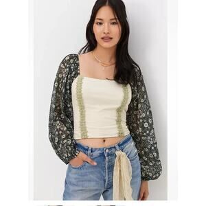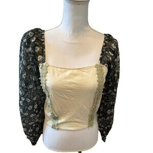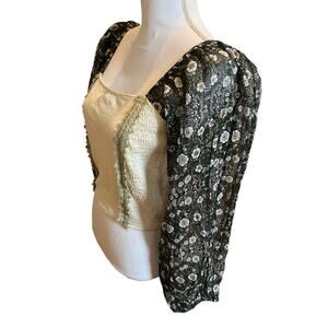New Anthropologie Forever that Girl Corset Style Puff Sleeve Top in Dark Botanical Print, size S. Stunning Dramatic 100% cotton top with corset lacing up back, Ruching at sides, Celery Green Lace Trim, a square neckline and semi Sheer Black Botanical Print Puff sleeves. Perfect Top paired with denim this Spring