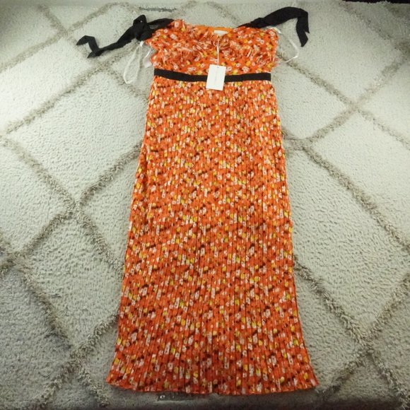 Anthropologie Foxiedox Floral Pleated Dress Womens Medium Orange NEW