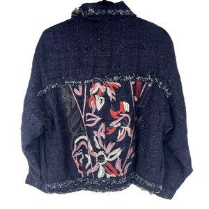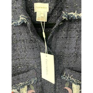 Foxiedox Navy color jacket with floral Takeo embroidery and black buttons. Textured/Tweedlike finish with floral embellished embroidery. Sparkle accents, lined with a fringe bottom hem detailing.