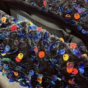 Dazzle at any event with this stunning sequin evening bag. Featuring a chic chain strap, this bag is perfect for adding a touch of glamour to your outfit. The black and blue sequins create a captivating look. New unused