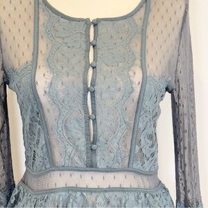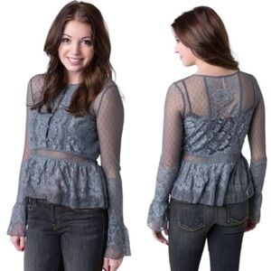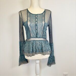 Size small. Button front mesh lace peplum top with bell sleeves.