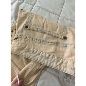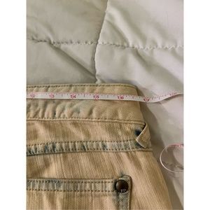 Cute FP jeans with bronze studs on hips. These are purposefully bleached, so some blue still peeks thru, and the rest is a very odd color, not bad at all, just difficult for me to match, so I never wore them. It’s kind of a golden yellow? Idk the color in these pics is pretty accurate. I just can’t describe it. Great shape, measurements shown in pics.