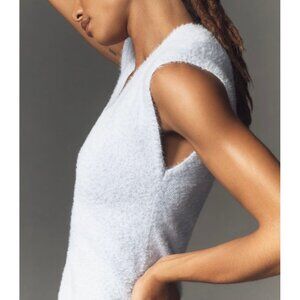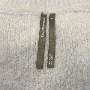 This blue Anthropologie fringe-trim sweater dress offers a textured, soft design with a modern edge. Suitable for professional or upscale events.