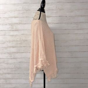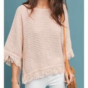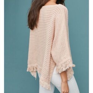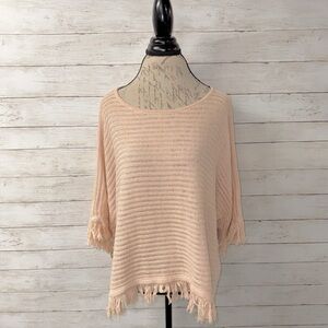 Anthropologie size small Frenchie Fringed Poncho Sweater in a light peach/pink. Pullover style. Boatneck. 1/2 length sleeves. Split side seams. Fringe along cuffs & straight hi-lo hemline.