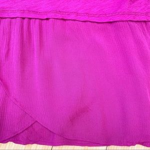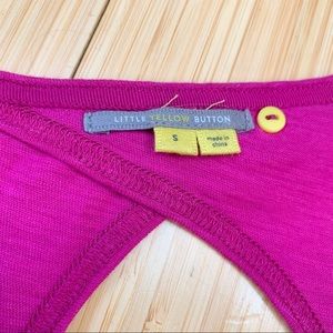 Anthropologie brand Little Yellow Button henley tank in fuchsia, size small. Beautiful purple pink with an open back, buttons at the chest, and a peplum like skirting. Unstretched waist measures 17.5 inches across, total length about 27 inches. There is faint spots in the skirting, please see picture. Will blend right in while you were wearing it. Priced accordingly. This is a generous size small, and could also fit a size medium.