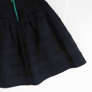 Wide stretchy defined waistband ~ Large pleats all the way around the skirt … under the waistband ~ Waistband and skirt are made from layered/tiers ~ Slightly curved hemline ~ Bell or A-line shape ~ Mini length ~ Exposed contrasting zipper closure on the back ~ Unlined textured ponte knit fabric … fabric has great stretch ~ Solid black … zipper/trim on the back is a contrasting green color