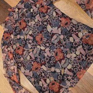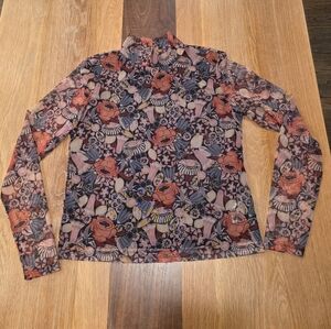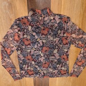 A floral print mock turtle neck by Anthropologie. The fabric is a semi sheer mesh with a tank top shaped black lining leaning the sleeves more mesh than the bodice.