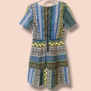 Anthropologie Plenty By Tracy Reese Geometric Patterned Short Sleeve V-Neck Fit And Flare Mini Dress Maximalist Office.
