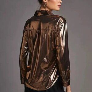 Anthropologie Gillian Liquid Shine Button Front Shirt is a gold blouse made of a polyester blend with a liquid metallic fabric type. The blouse has a collared neckline and long sleeves with a classic/fitted sleeve type. It is a relaxed fit shirt that is suitable for party/cocktail, casual, and business occasions. The blouse is hand wash only and features a lightweight and stretch fabric with all-seasons capability. The shirt is a size XXS.