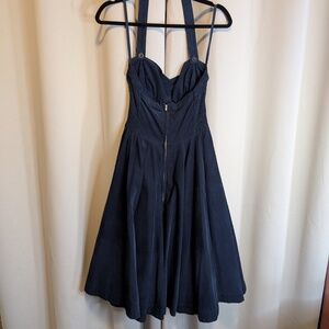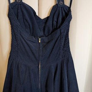 Anthropologie's Girls from Savoy collection. Made from lightweight navy blue corduroy, it features a full slip with charming crochet trim. The adjustable and removeable halter strap and ruched sides provide a comfortable, secure fit, while the feminine sweetheart neckline adds a touch of retro flair. The full skirt flares beautifully and falls just below the knees, making it both flattering and versatile.