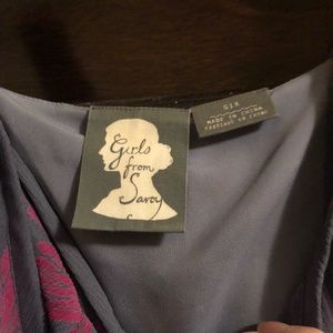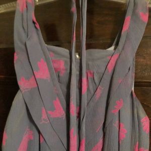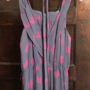 Girls from Savoy sleeveless dress from Anthropologie, size 6. Grey-blue with pink flowers. Or maybe they're butterflies? But either way, very cute crepe dress with a waist sash. 1940s look, great for a party or wedding.