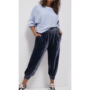 Anthropologie/Free people size medium women's velvet pants style obi223244. viscose nylon stretchy elastic waistband pockets jogger tapered leg super high rise casual loose fit loungewear cozy still sophisticated though. Doesn't have the stringy belt. Inseam 25. rise 15 flat across waistband 15 with stretch, pretty blue metallic silver gray color excellent pre-owned condition!!