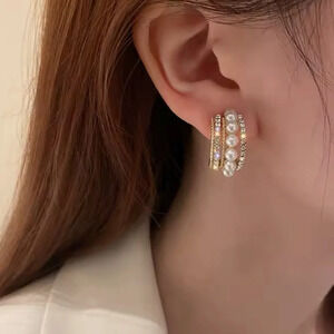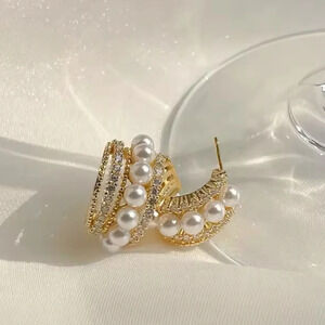Anthropologie Gold Crystal Pearl Hoop Earrings