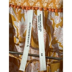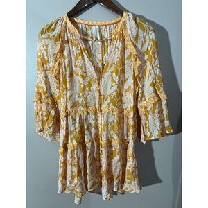 Discover the charm of the Anthropologie Gold and White Ruffled Blouse, featuring a romantic v-neckline and 3/4 length sleeves with tiered details. This top boasts a relaxed fit with a gathered waist, perfect for a bohemian-inspired look. The delicate floral pattern in golden yellow and white adds a touch of elegance to any outfit.it to pit 19” length 29.5”