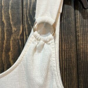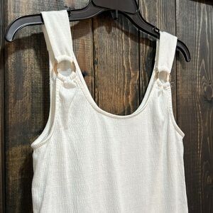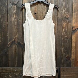 Anthro brand Green Envelope mini jumper dress. Size small. Cream / Beige with gold hardware. Ring details on straps. Sleeveless. Stretch material. Light knit. Great for Spring & Summer. Wear alone or use as a swim cover. Semi-sheer. Preloved. Please see all photos for condition.