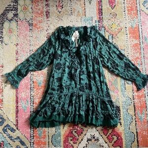 Elegant green mini dress with floral pattern. Features ruffled neckline and hem. Long sheer sleeves add sophistication.