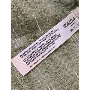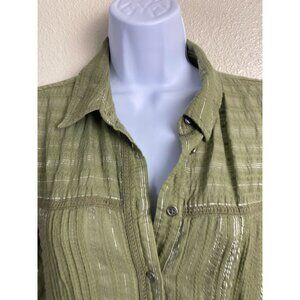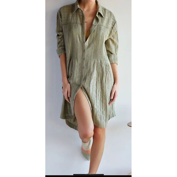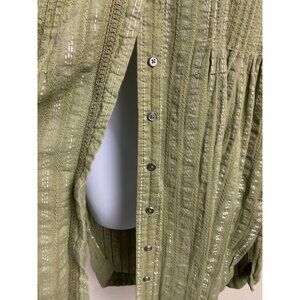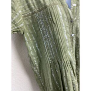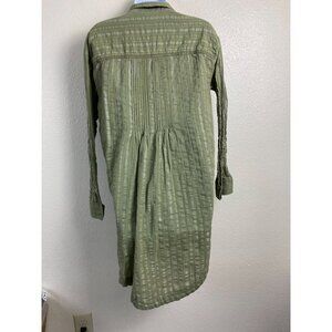 Anthropologie Green Pintuck Shirt Dress Button Up Long Sleeve Women size Small Metallic Thread Cotton Blend