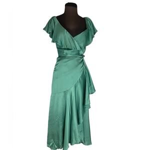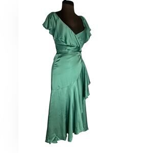 Anthropologie Green Satin Ruffle Wrap Coquette Feminine Midi Maxi Dress XXS NWT