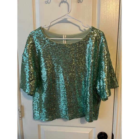 Add some sparkle to your wardrobe with this Anthropologie green top! Perfect for parties or a fun night out. This short-sleeve top features eye-catching green sparkles that will make you shine. Great for New Year's Eve or any special occasion. Pair it with your favorite jeans or a skirt for a festive look. Get ready to turn heads and feel fabulous! This top is in excellent condition and ready for a new home. Don't miss out—grab it now and sparkle all night long!