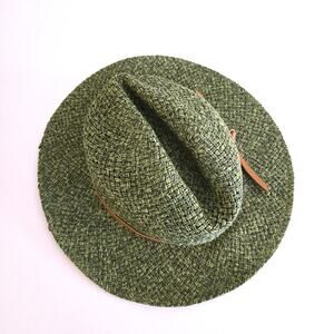 Color: Beautiful variegated olive green woven straw, offering a unique, textured appearance. Adorned with a contrasting tan/cognac faux leather band around the crown. Features a black interior sweatband and adjustable tie.