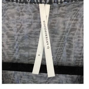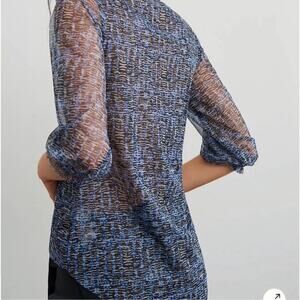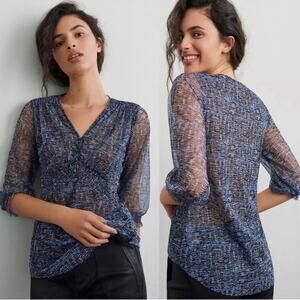 Anthropologie Gretchen Smocked Sheer top blouse Vneck. Blue and black. Sheer sleeves . Flowy. Pullover styling. 3/4 sleeves. Tunic silhouette.