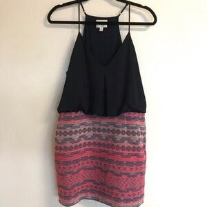 Hidden zipper closure on the side. Adjustable spaghetti straps. Midnight blue on top with a chiffon fabric. Bottom is a woven boho pattern with ombre coloring. The skirt is lined and the top is lightly lined. Deep v neck. See photos for measurements. Not stretchy. Can be dressed up for the office with a blazer over top. Officecore, Corpcore, Secretary, Workplace Siren, Boardroom chic, Feminine, dinner, date night, brunch, beach, euro summer, boho, festival, concert, Y2K, girly