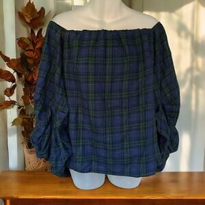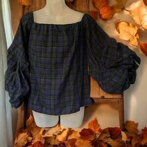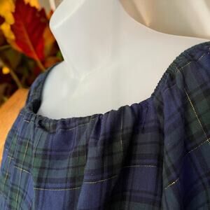 Anthropologie Greysn Soft Plaid Off-the-Shoulder Pleated Bellsleeve Blouse Top CONDITION: Excellent preowned BRAND: Greysn, Anthropologie SIZE: women's XS COLORS: navy blue, green, metallic gold lurex FEATURES: soft-knit fabric, plid pattern, off-the-shoulder with stretchy neckline, billowy bellsleeves with pleated details TAGS: boho bohemian hippie retro festival mod
