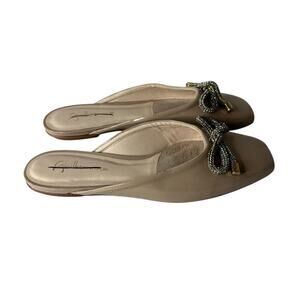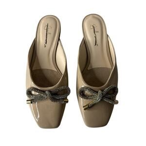 Guilhermina Ballet Flat Mule in Beige. Size 6. Features square toe, patent leather upper, crystal embellished ribbon, leather lining and sole, and slip-on. Excellent pre-owned condition.