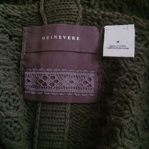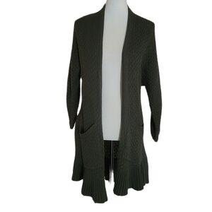 Excellent pre owned condition. Anthropologie Guinevere Army Green Knitted Ruffle Hem Midi Cardigan. Open front. Long sleeves. Two front pockets.