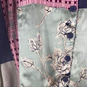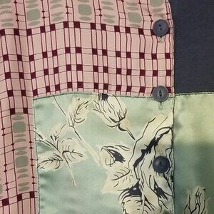 Features Silk patterned patchwork design on the front. Flower detail. gorgeous asymmetrical color block patchwork pattern of botanical florals, in jewel tones, 3/4 length sleeves