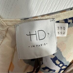 Beautiful Anthropologie HD In Paris Paisley Moonset silk asymmetrical top. Size 10P. Spaghetti straps, v-neck, partial lining, asymmetrical hem. 100% silk. Tan/blue/orange/cream pattern.