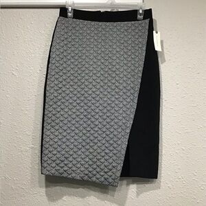 Elevate your wardrobe with this chic HD in Paris “Addie” Skirt from Anthropologie. Featuring a sophisticated asymmetrical faux wrap design, this knee-length skirt combines a classic black panel with a textured geometric overlay in gray. A modern, structured silhouette makes it ideal for the office, events, or an upscale casual look.