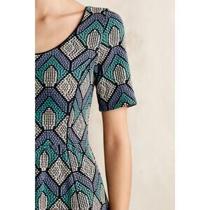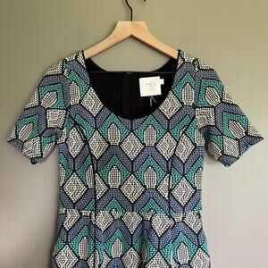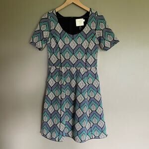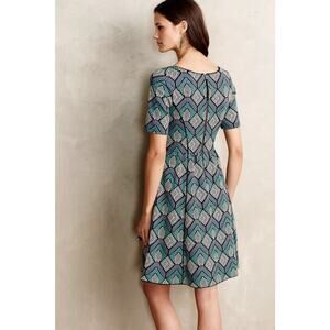 Anthropologie HD in Paris Hollyhock Dress, Size Small, Short Sleeves, A-Line Silhouette, Blue Green Black Beige Geometric Jacquard Pattern, Round Neck, Excellent Condition with No Flaws.