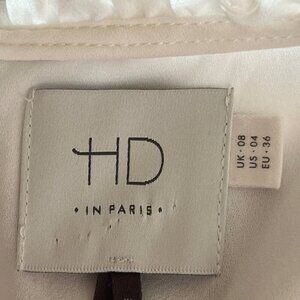 Anthropologie HD in Paris women's blouse, size 4. Style name is Josie Clipdot Blouse. Sheer sleeves with white dots. Lace trim at neck. Keyhole at neck, can be worn open or closed. Button closures down back and at cuffs. One of the buttons on the back is a little loose. Gently worn, in very good used condition. No rips or stains.