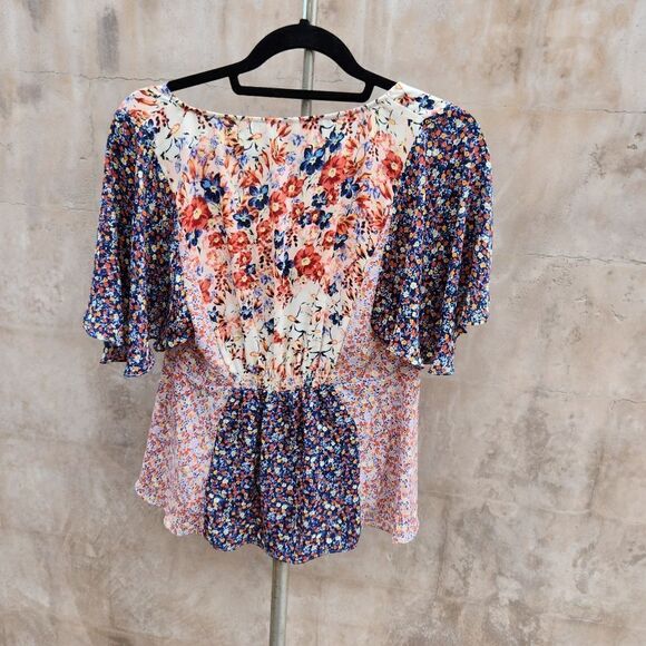 mixed media floral block flutter sleeve blouse. popver short sleeve tunic style. flowy fit. Gently preloved condition. Any flaws will be noted.