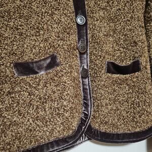 Notes: Brown boucle textured knit cardigan blazer with button front, shawl collar, and velvet trim on collar, placket, hem, and pockets. Cozy and structured — perfect for layering.