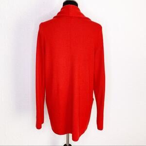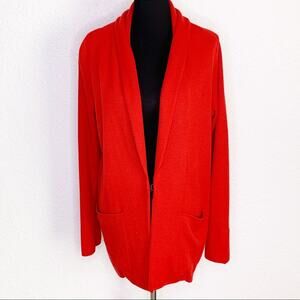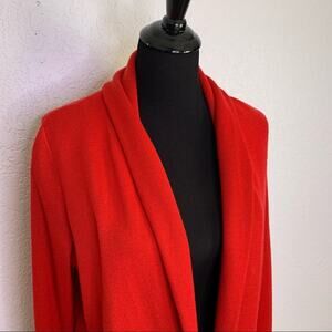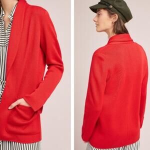 Anthropologie HWR Monogram Owen red long blazer cardigan. Open front with foldover collar. Hook and eye closure in front. Slit sleeve cuffs. Double front open pockets. Size Medium. Excellent preowned conditon. A couple of tiny snags as shown and minor fuzzing - normal with wool. 50% wool 50% acrylic.